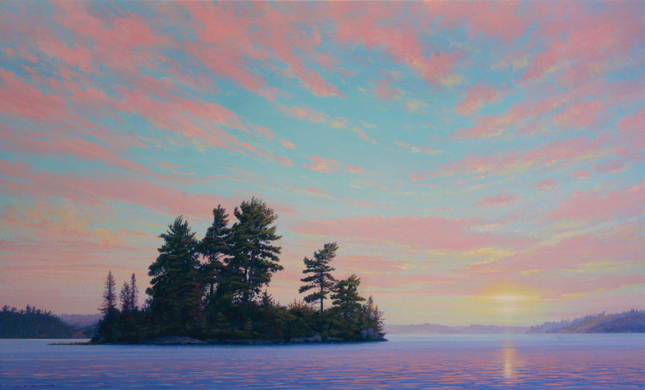 Recently added to the “Island Series” is this sunset painting from Lake of the Woods. It was not the obvious that intrigued the mind and heart but rather the transition of subtleties. There is a time of day when the transitions happen so quickly and light fades to darkness which is mesmerizing. This painting embodies that transition and the light that makes it happen.